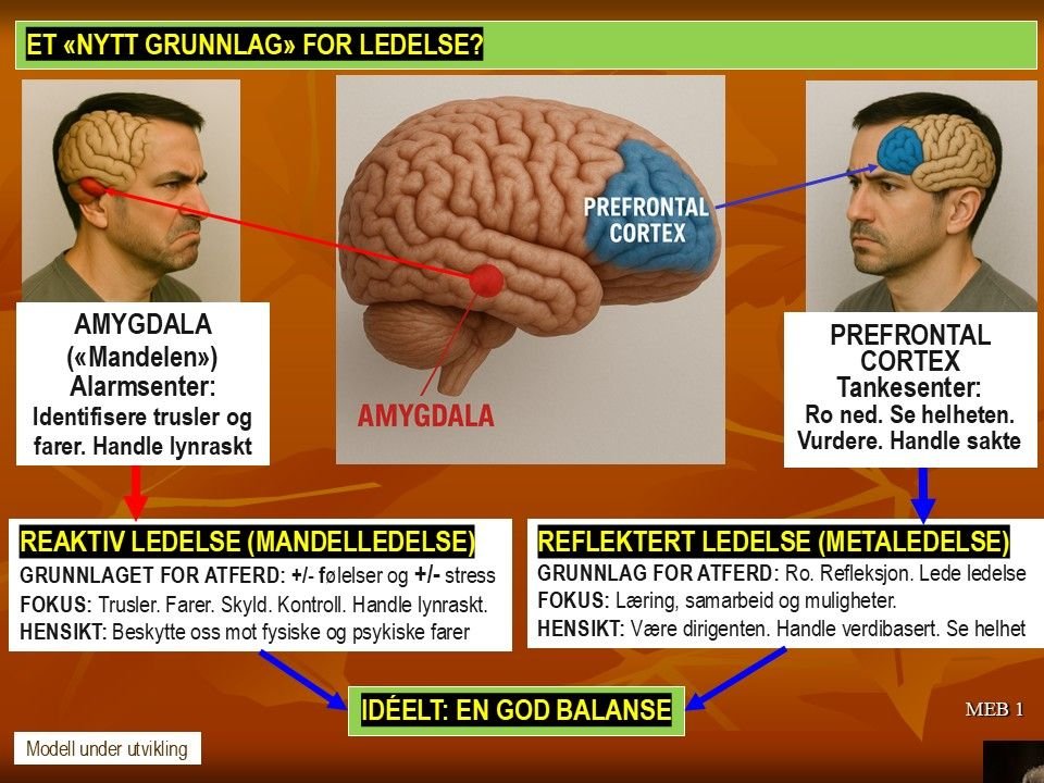 En for sensitiv amygdala fører til mandelledelse. Mandelledelse er ofte preget av negative følelser og ubehagelig stress. Det er ingen god form for ledelse. Metaledelse, på sin side, er å lede sin egen ledelse. En ser seg selv utenfra. Det er ofte en god form for ledelse. Problemet er imidlertid at mandelledelse kan komme så raskt og være så sterk at den «vinner» over metaledelse. Da bli det såkalt «mandelkapring. Det er dårlig ledelse, men også meget vanlig!