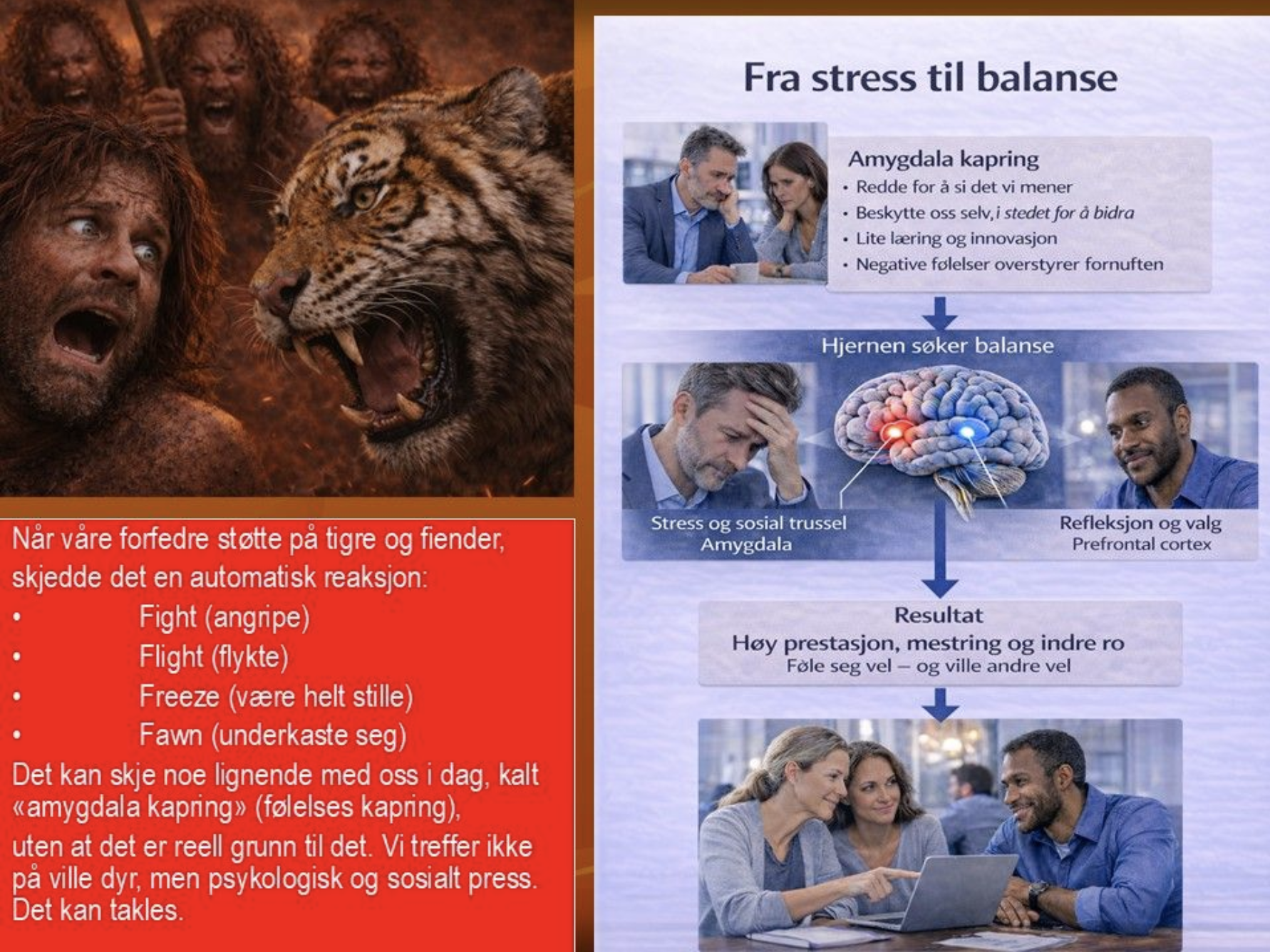 Våre forfedre overlevde «fight, flight, freeze» situasjoner, der tigre og fiender var trusler. «Hjernens alarmsystem», amygdala, ga beskjed om fare. I det moderne samfunn kan denne alarmen fremdeles gå, selv om truslene fra «tiger og fiender» ikke er reelle. Du føler likevel stress og uro, selv om du er usikker på årsaken.